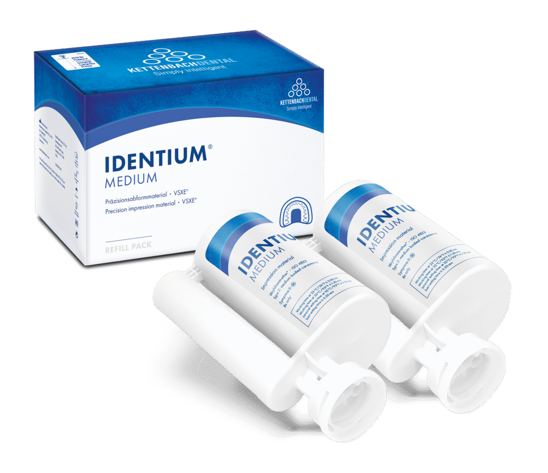 Identium® Medium is a medium-viscosity precision impression material made of Vinylsiloxanether® for monophase impressions. Thanks to its high final hardness it is particularly well suited to implant impressions. The high final hardness (Shore A 60) ensures precise reproduction and secure retention of the implant posts and primary crowns.
