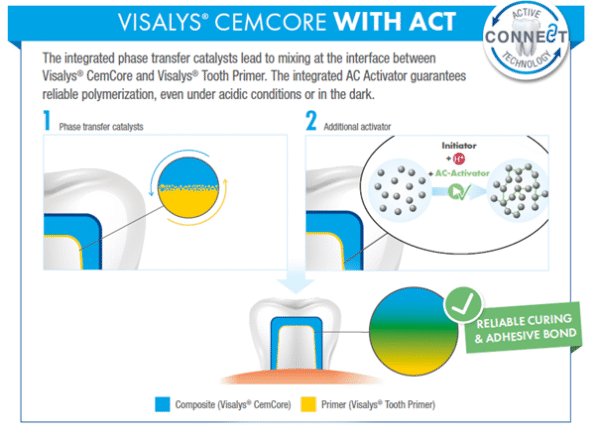 Cementation composites must be as hydrophilic as possible while also having very good flowability. Core build-ups require a high degree of stability and a material that swells as little as possible. Kettenbach Dental has developed a groundbreaking technology that simply eliminates the conflicts: Active-Connect-Technology (ACT) allows optimal mixing of the somewhat hydrophobic cementation composite Visalys® CemCore with the hydrophilic Visalys® Tooth Primer on the damp surface of the tooth. The innovative composite achieves a high adhesive strength despite its hydrophobic properties while also avoiding swelling.