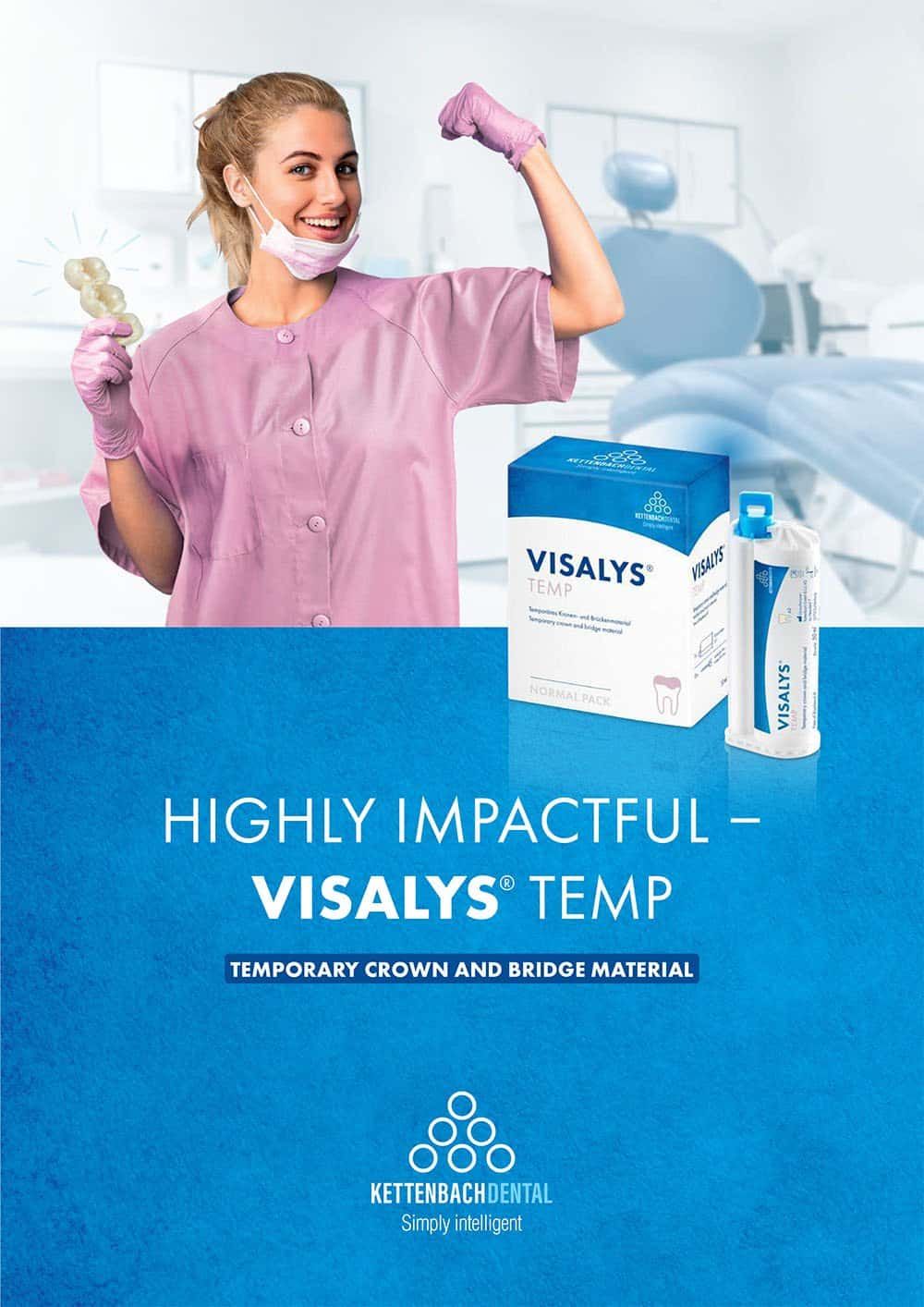 Visalys® Temp from Kettenbach Dental is ideal for the fabrication of temporary crowns, bridges, inlays, onlays, and veneers. It is perfectly suitable for long-term temporaries and has exceptional fracture resistance and very good marginal stability. It offers excellent flow, thixotropy, stability, and user-friendliness. It has a low smear layer and finishes quickly and beautifully to a high gloss. Its natural translucency and opalescence provide for seamless integration in the oral situation, and it is a safe choice as it does not contain bisphenol A.
